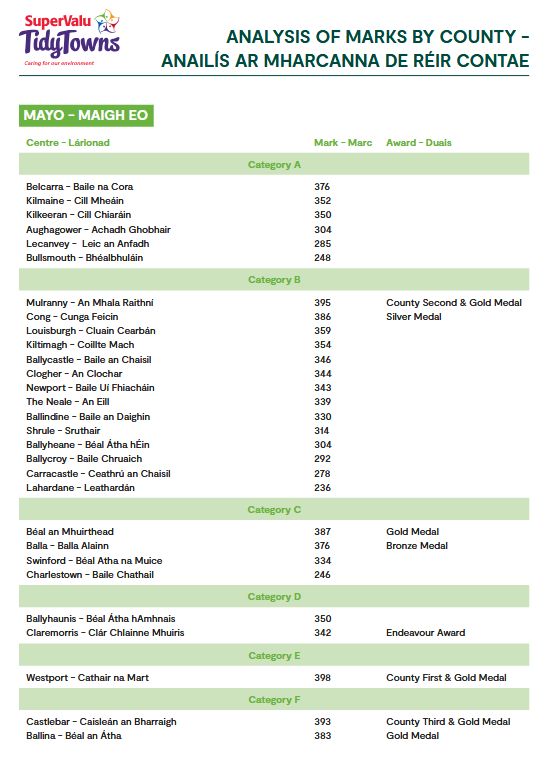 This takes continuous effort from everyone in Ballyhaunis and the surrounding townlands. Thank you for making Ballyhaunis an inclusive, biodiverse, tidy and safe place to live.